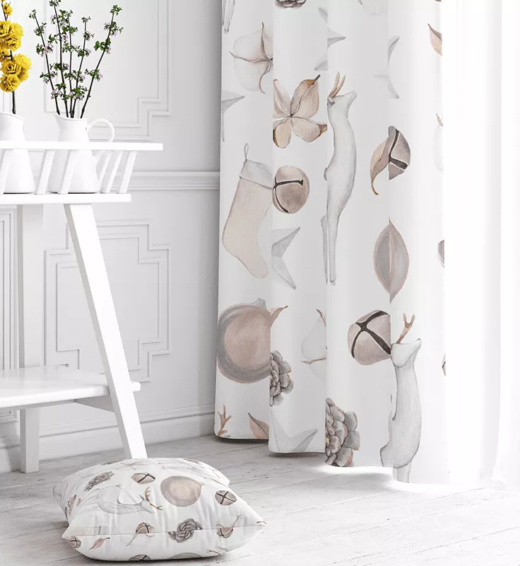 Dekoračný záves s krásnym vianočným motívom do spálne alebo obývačky s bielymi srnkami. Vianočné závesy môžete kombinovať s inými produktami z našej vianočnej kolekcie.